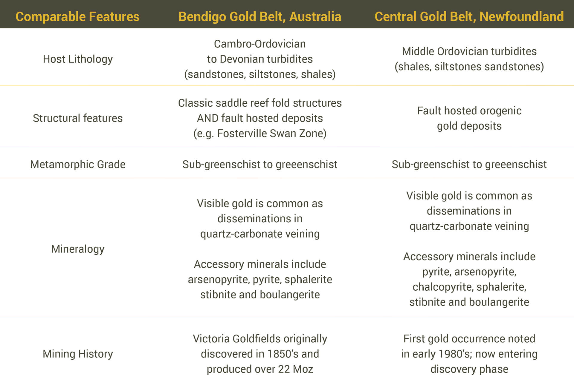 While no two mineral systems are ever identical, there is strong evidence to suggest the Central Newfoundland Gold Belt has many similarities to the Bendigo goldfields in Victoria state, Australia which New Found Gold is using as an early geological mode.