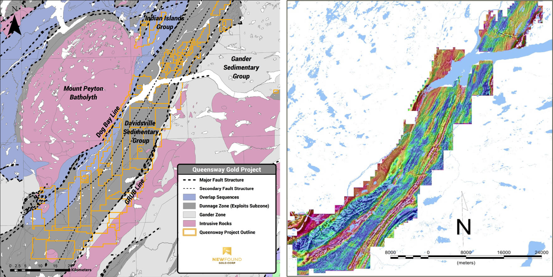 The Dog Bay Line (DBL) is a significant suture formed at the closing of the Iapetus Ocean and can be found on both sides of the Atlantic Ocean. New Found Gold identified this structure for its significant gold potential and consolidated land holdings over a 105km segment of the structure in Newfoundland, Canada.