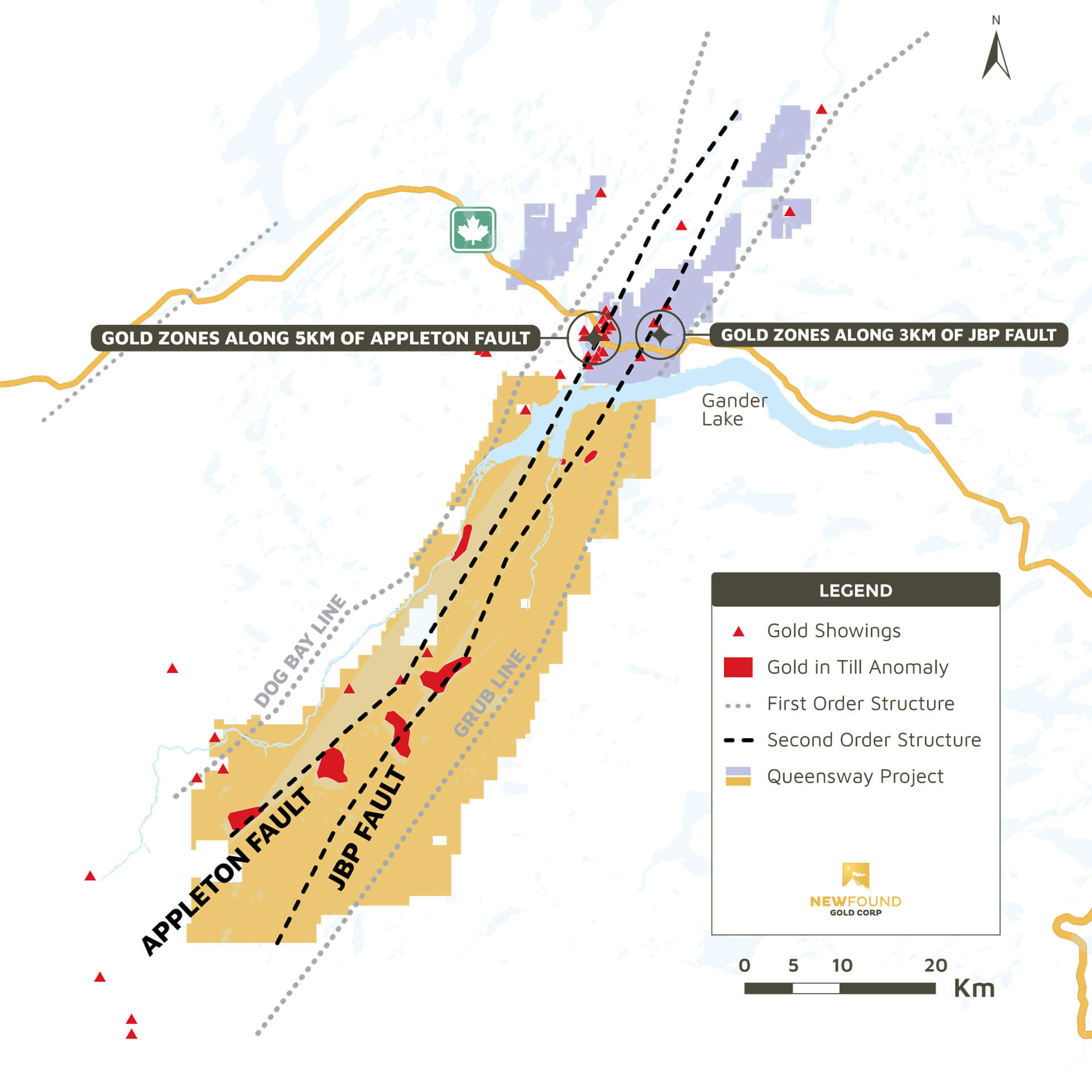 A very large scale regional till program by New Found has identified large gold in till anomalies coincident with the Appleton and JBP faults on Queensway South, covering areas up to 5km x 2km.